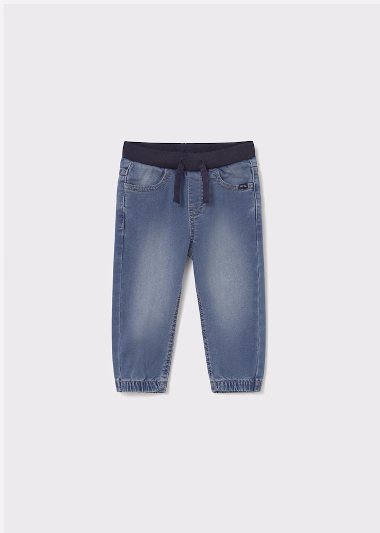 Joggers for baby, baggy at the top of the joggers but narrower towards the ankle. They are perfect for sporty looks, reflecting the influence that sport has on everyday fashion. Elasticated waistband with adjustable drawstring. Comfortable denim fabric, perfect for everyday outfits.
