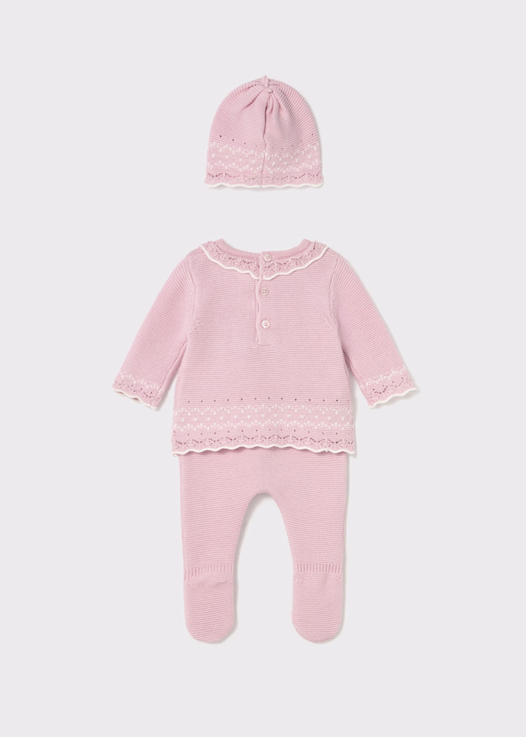 Three piece set for newborn baby girl. Knitted fabric, soft and pleasant to the touch. Long sleeved Sweater for newborn baby girl. Button fastenings down the back to allow the garment to be put on and taken off easily. Pants with leg warmers. Elastic waistband. For this item, the larger sizes (from 6-9 months to 18 months) will not have feet. This is to allow better mobility and more comfort. Sweet newborn hat. Decorative elements: Bow. This item is sent in a box from the Newborn collection, ideal to be given as a gift on special occasions.