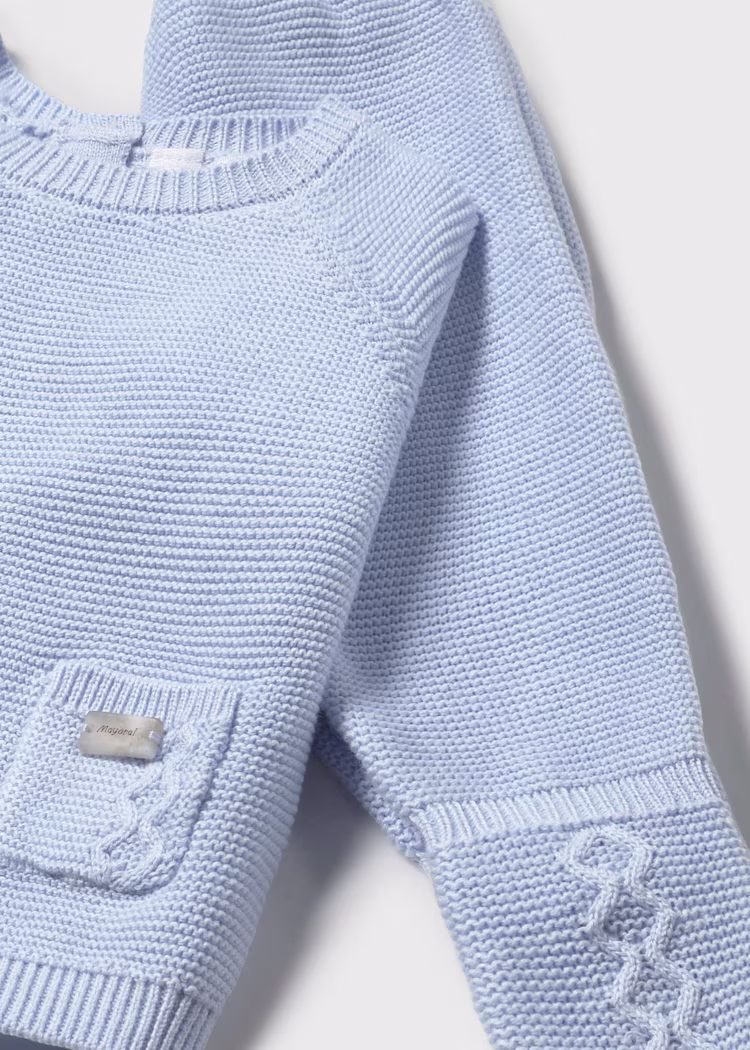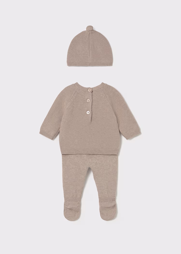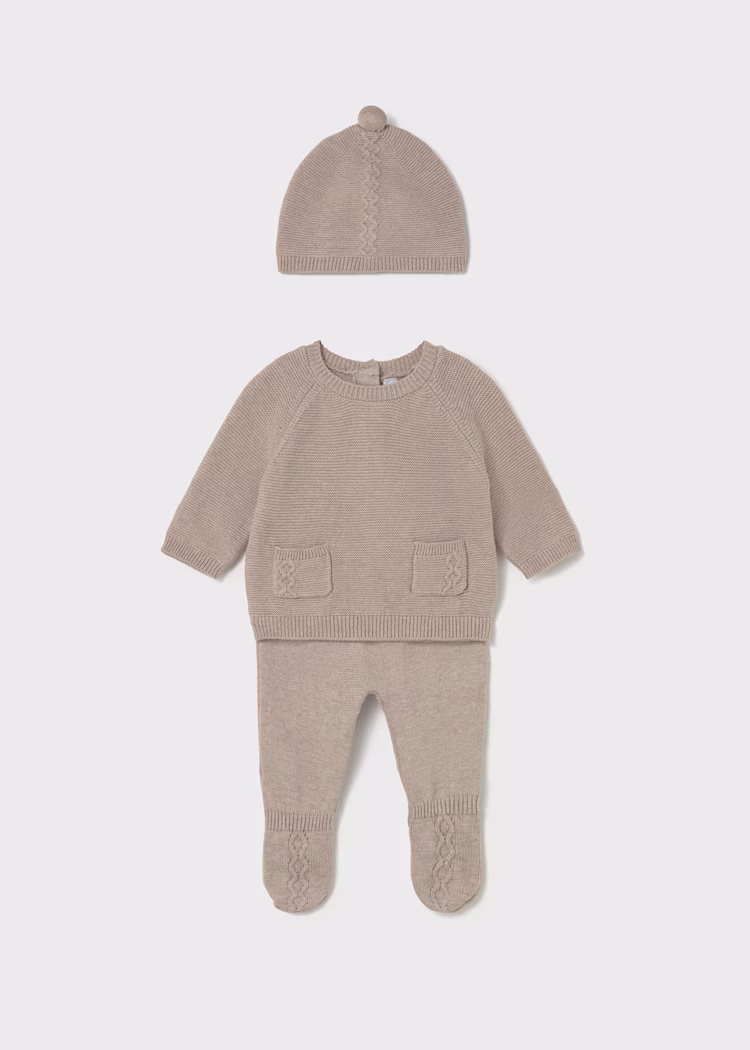 Adorable three-piece outfit for newborns, made from soft, comfortable knit fabric. Raglan-sleeved sweater for newborns with button fastening at the back for easy dressing. Features functional front pockets and decorative braided details. Footed pants with an elastic waistband and ribbed trim details. For sizes 6–9 to 18 months, the design does not include feet to allow better mobility and increased comfort. The stretchy waistband adjusts to your baby’s growth. Sweet newborn hat with ribbed trim details. This set comes in a Newborn gift box, perfect for special occasions.