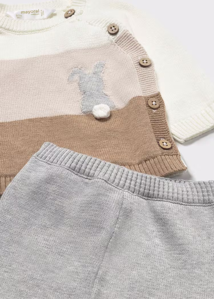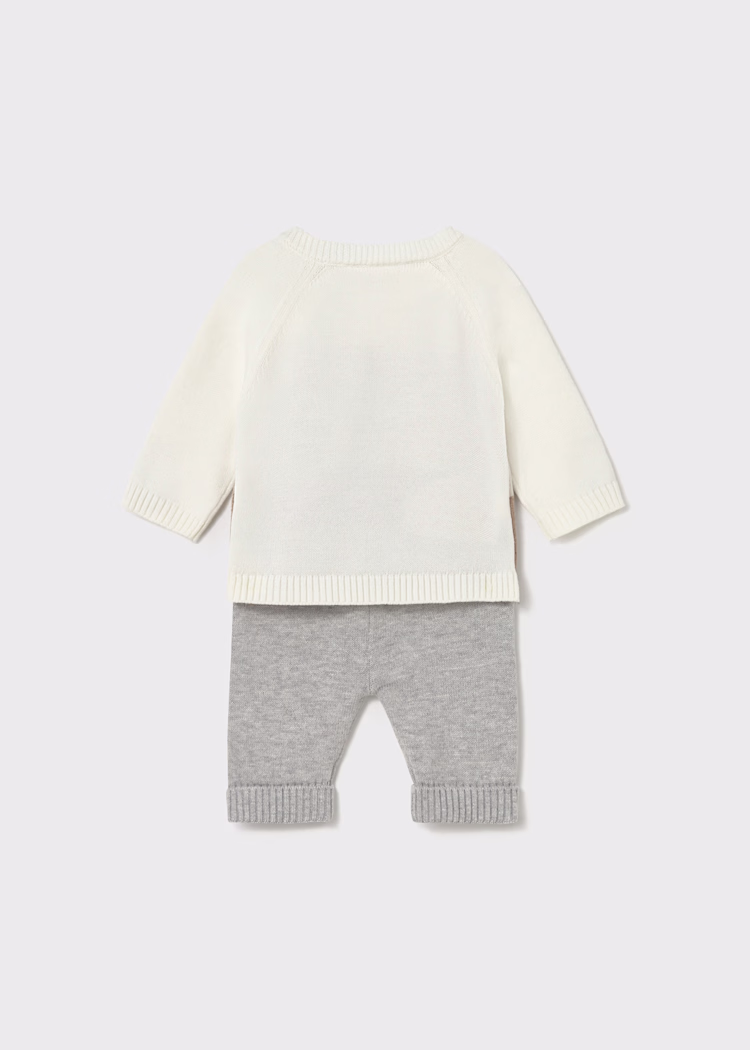 Matching sweater and pants set for newborn baby boy. Long sleeved Sweater for newborn baby boy. Round neckline. Side fastening with press studs. Decorative elements: pompom. Jacquard stitch designs. Intarsia woven design technique. Pants for newborn baby boy. Elastic waistband. Knitted fabric, soft and pleasant to the touch. Upturned hem.
