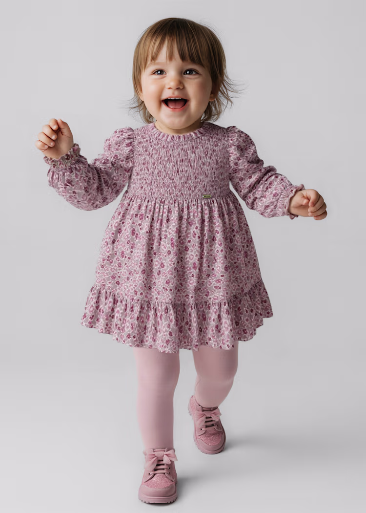 Long sleeved Dress for baby/girl. Central rear zip fastening with concealed zip. Includes an inner lining. This model has honeycomb detailing. Gathered and ruffled design. Patterned design.