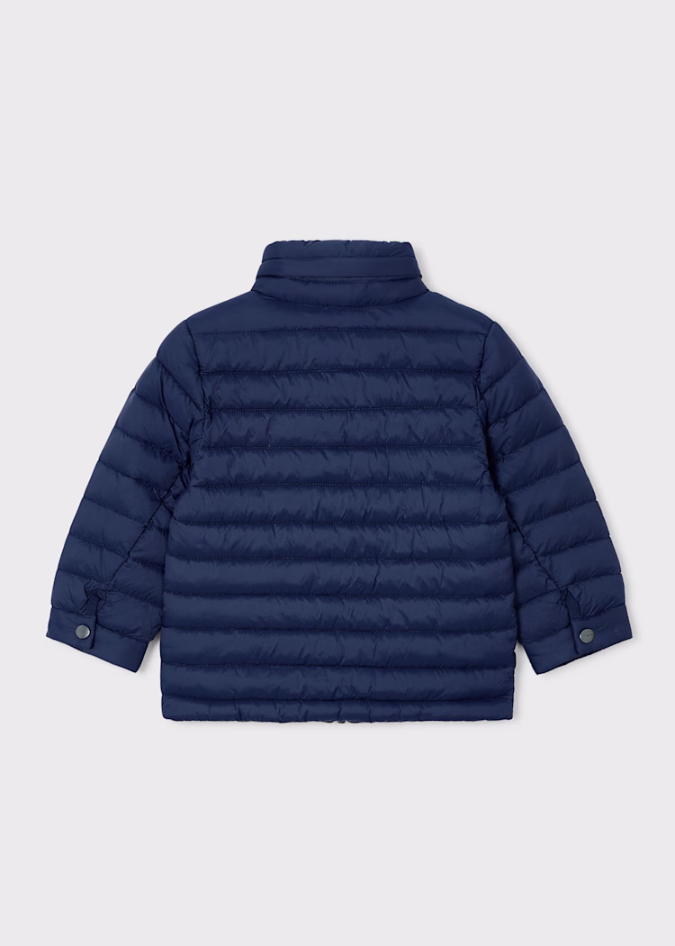 Contains recycled polyester. Long sleeved Puffer jacket for boys. Wraparound collar. Hidden hood. Front, central zip fastening. Textile exterior with quilted effect. Pockets with zips.