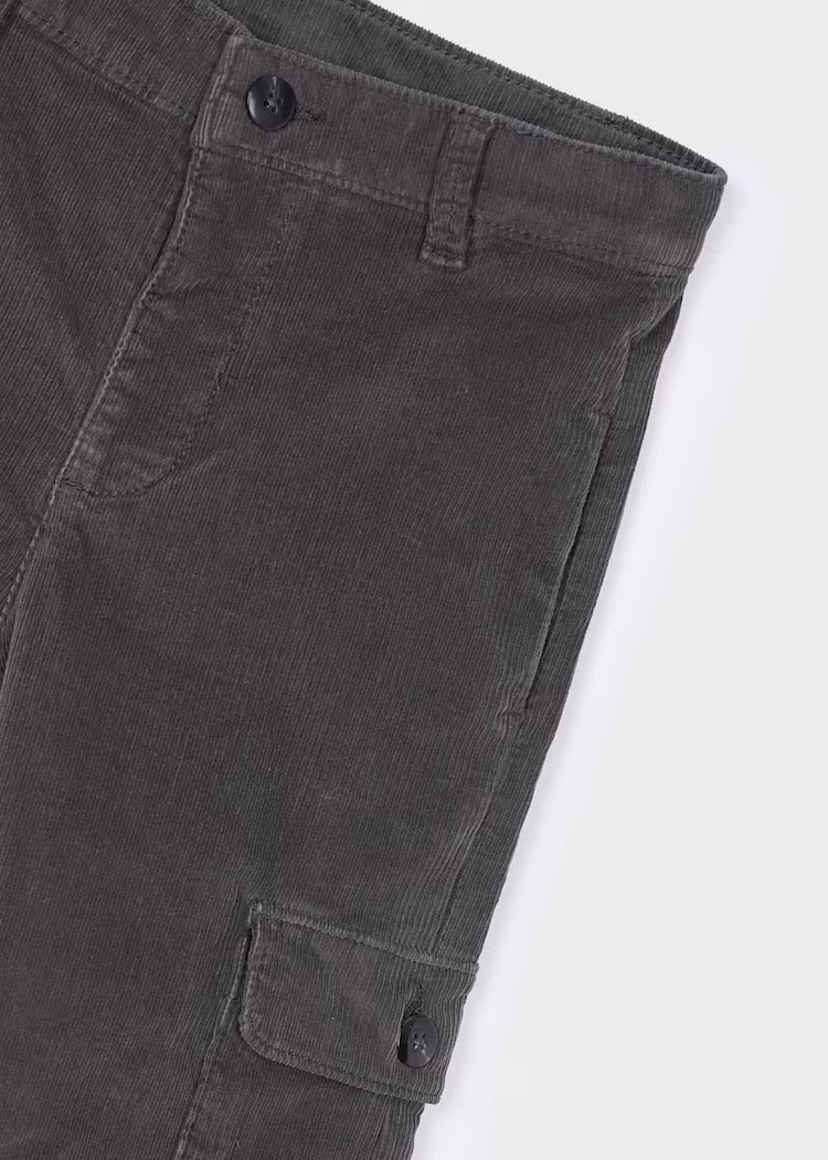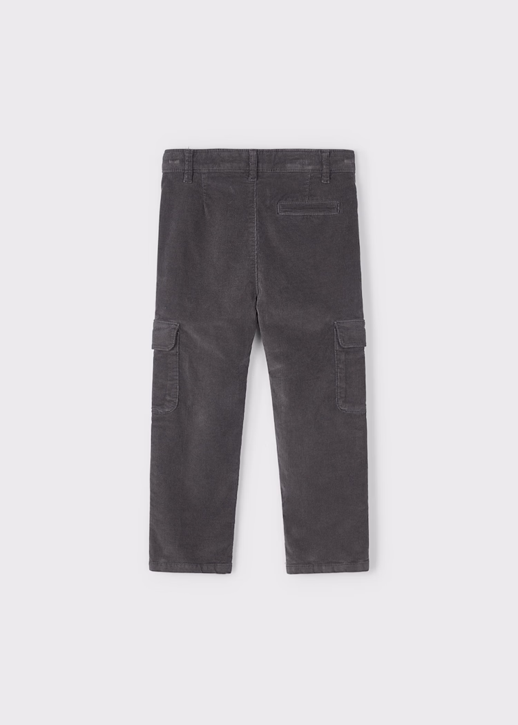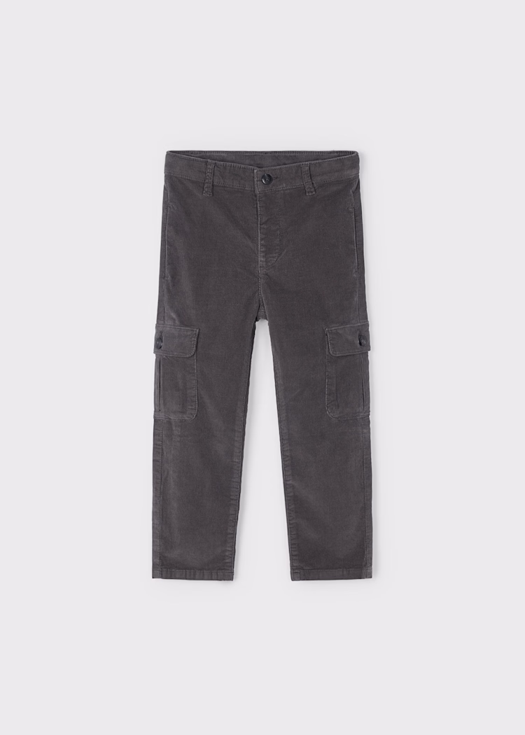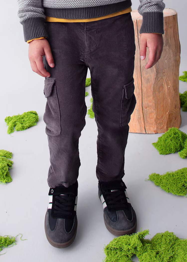 Cargo style long pants for boys loose at the top, drop crotch and regular fit at the leg. Zip and button to fasten. Adjustable elastic waistband with buttons inside the waistband for a better fit. Design with multiple pockets. For safety reasons, the smaller sizes (2-5 years) will not have a zip, instead there will be false flies.